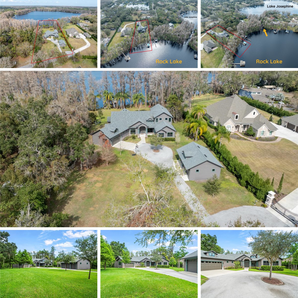 We are pleased to present this MAGNIFICENT, ONE OF A KIND HOUSE situated on a SPECTACULAR 1.76 ACRE, CUL DE SAC LOT on SKI SIZE ROCK LAKE! Built in 2017, and having OVER 150 of lake frontage and access to another nearby ski lake (LAKE JOSEPHINE), this 4 Bedroom, OFFICE, ENTERTAINMENT/GAME ROOM, 4.1 Bath, custom built home with 4,581sq. ft. of incredible living space, features: a light and bright, open floor plan with volume ceilings and neutral décor; a SPECTACULAR KITCHEN with stainless steel appliances, quartz counter tops, enormous island and walk in pantry; a GREAT ROOM sure to please, offering lake views, high ceilings with decorative beams, transom windows, plenty of room for entertaining or simply relaxing, custom built ins, and a gorgeous fireplace; a spacious, FIRST FLOOR PRIMARY SUITE with two large walk-in closets and beautiful master bath; TWO EN SUITE, FIRST FLOOR secondary bedrooms; a fourth bedroom upstairs with full bath and located adjacent to a LARGE BONUS ROOM with covered deck that offers amazing lake views; French doors and hardwood floors; HUGE SCREENED LANAI with hot tub, great for entertaining; TWO CAR ATTACHED garage and THREE CAR DETACHED garage; HOUSE GENERATOR; covered dock with lift; immaculate interior/exterior condition and much more! Add to these a CONVENIENT LOCATION for schools, shopping, dining, medical facilities, and interstate travel, and you have a fantastic place to call home!